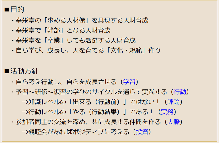 従業員が「自ら育つ意思」をもって自らの能力開発に取り組む自己啓発を推奨し、会社はこれをサポートする立場から「学習機会」を提供しています。(教育:誰かに教えてもらうではなく、学習:自ら学ぶ機会の提供です。)